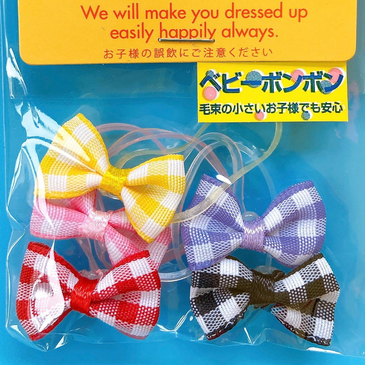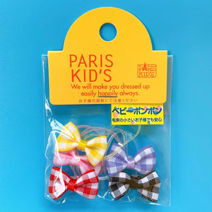 Set of 5 hair bands with little bows by Paris Kids. The colours shown in the photo will be the colours you will receive. Material: polyester, rubber. Bow measurements: 2.5 x 5 cm.