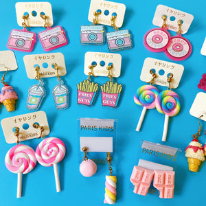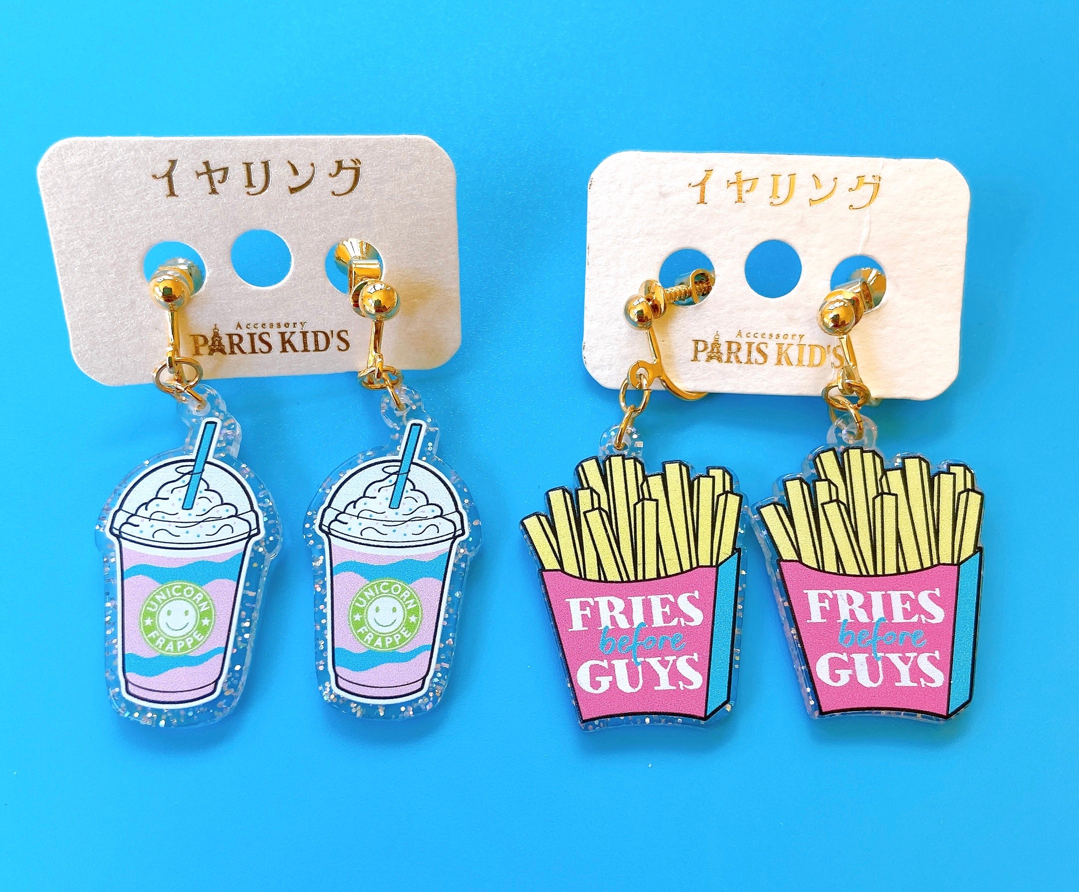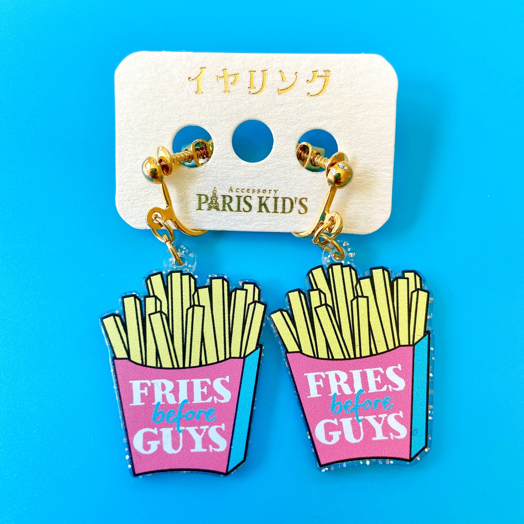 Fast food themed clip-on earrings by Paris Kids. Features the words "Fries Before Guys" on the fries with a clear glitter background. Material: plastic, metal.Fries measurements: 3 x x 2.3 x 0.3 cm.