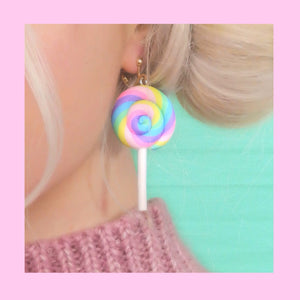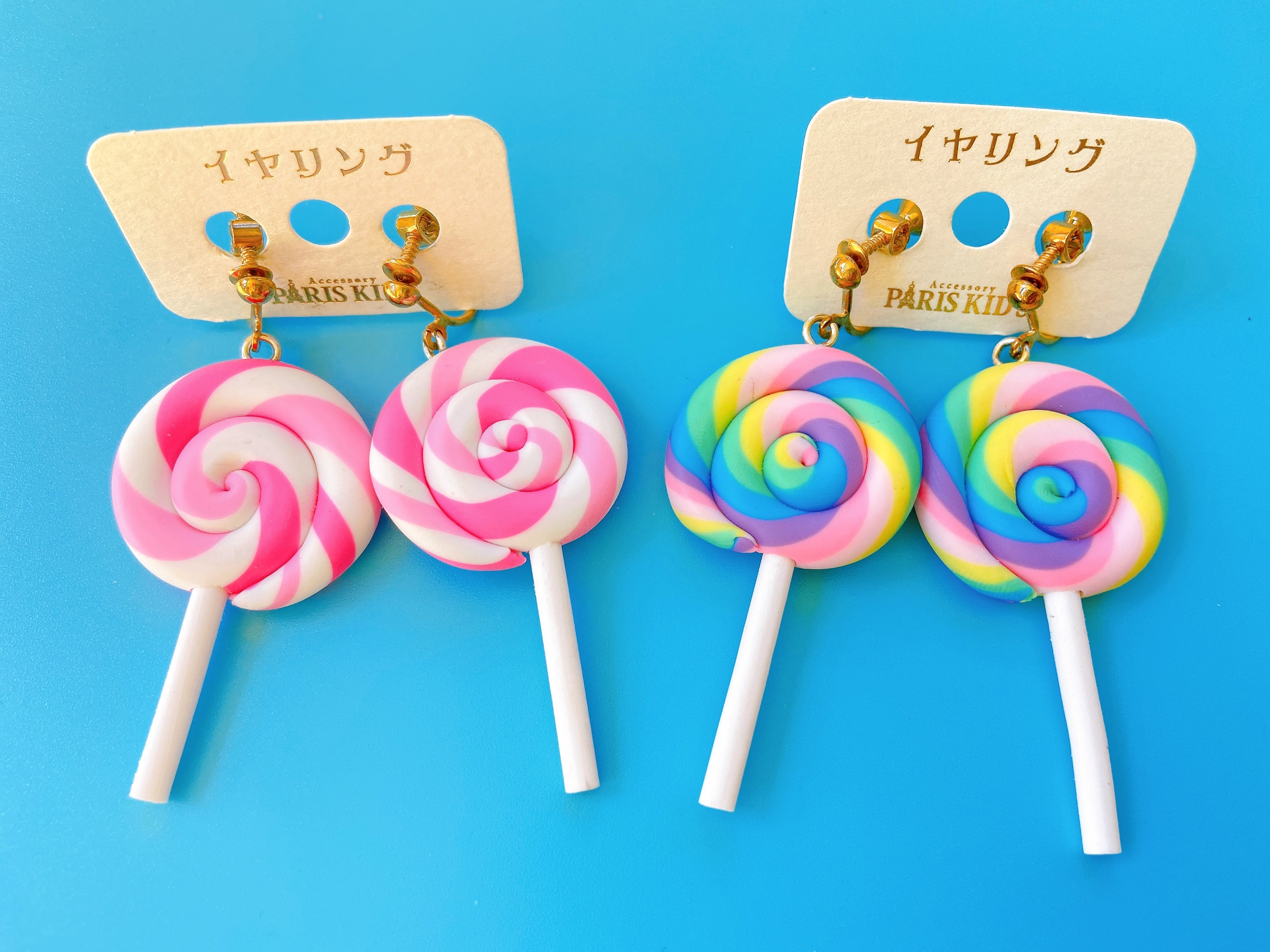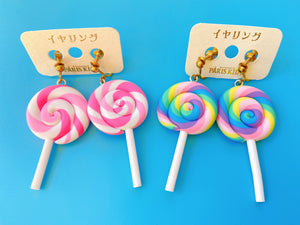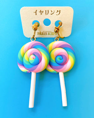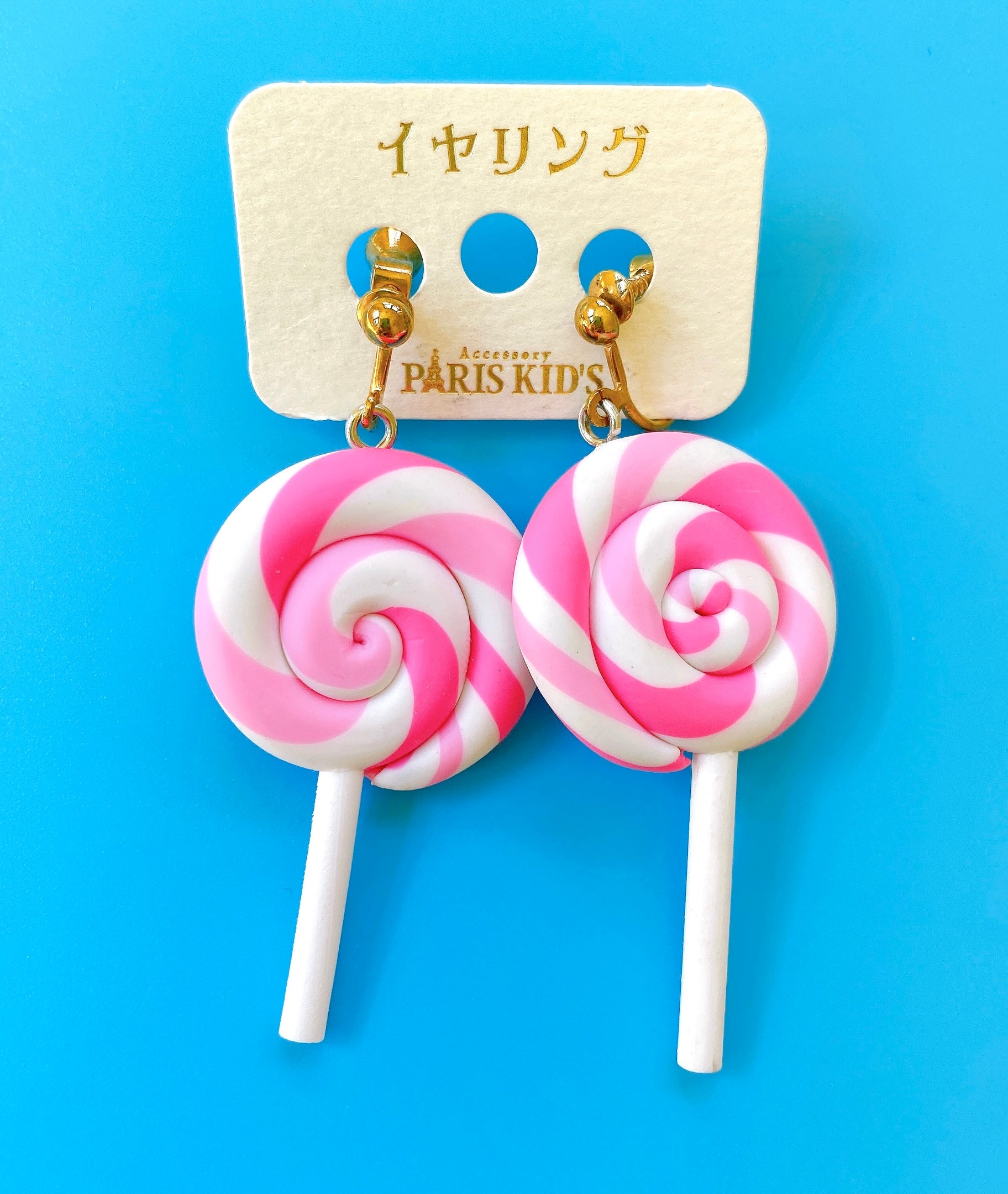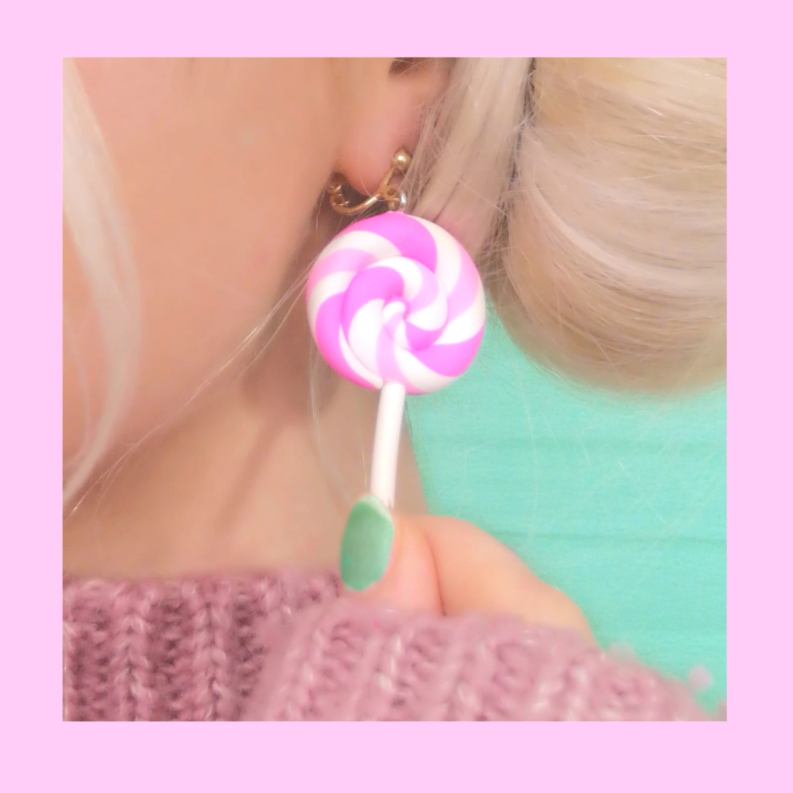 Paris Kids clip-on lollipop earrings. Material: polymer clay, rubber lollipop stick, metal. Lollipop measurements: 5 x 2.5 x 0.7 cm