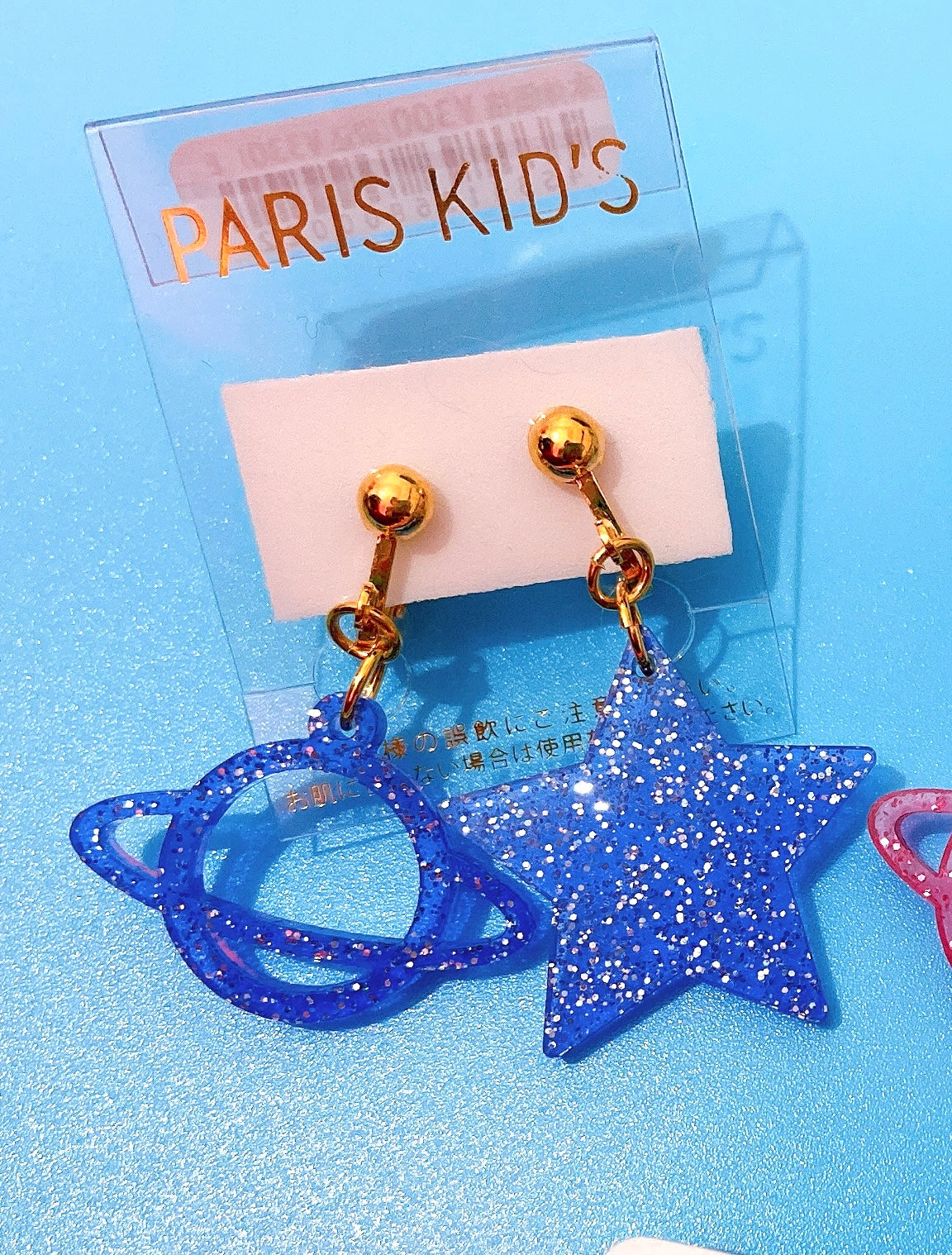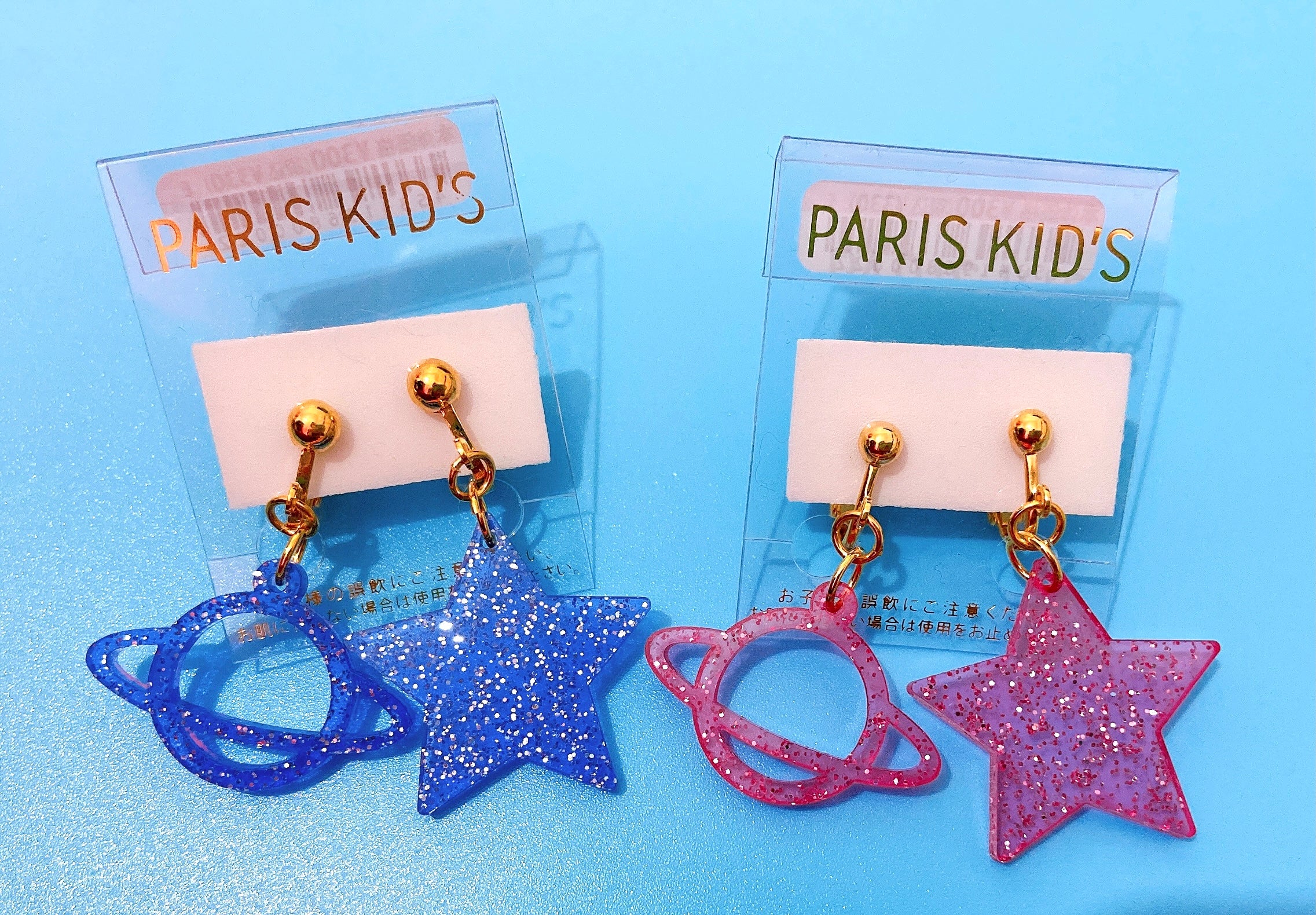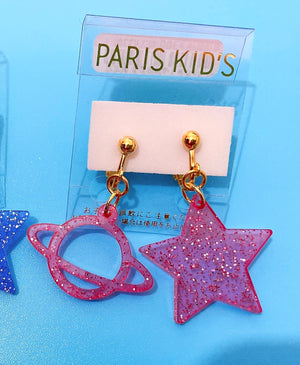 Pair of mismatch glittery Saturn and star clip-on earrings by Paris Kids. Material: plastic, metalMeasurements: 2 x 2 cm