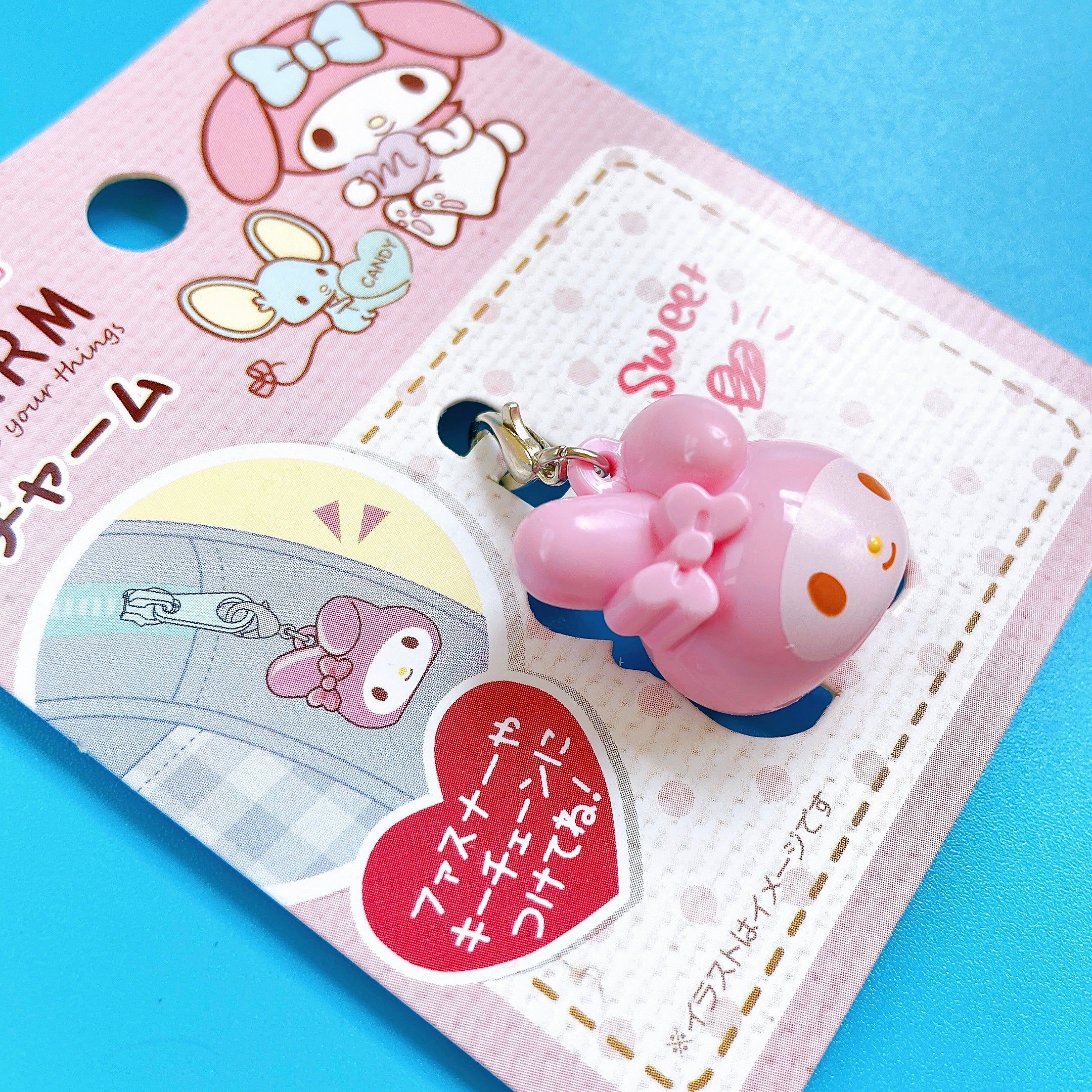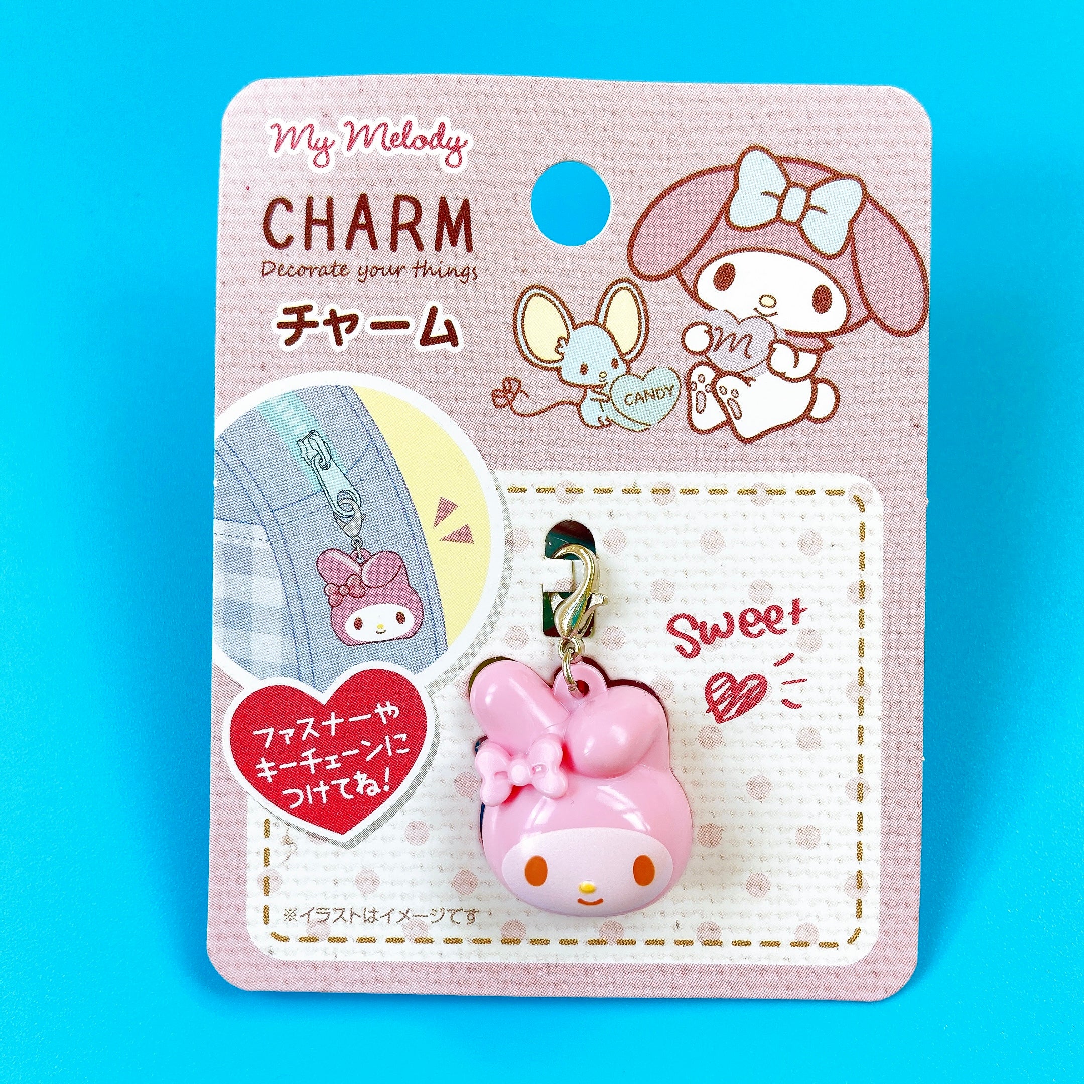Official Sanrio merchandise. My Melody charm with a clip on top that can be attached to zippers, clothes and accessories. Material: charm: ABS resin. Clip: zinc, iron.My Melody measurements: 2.3 x 2.2 x 2 cm